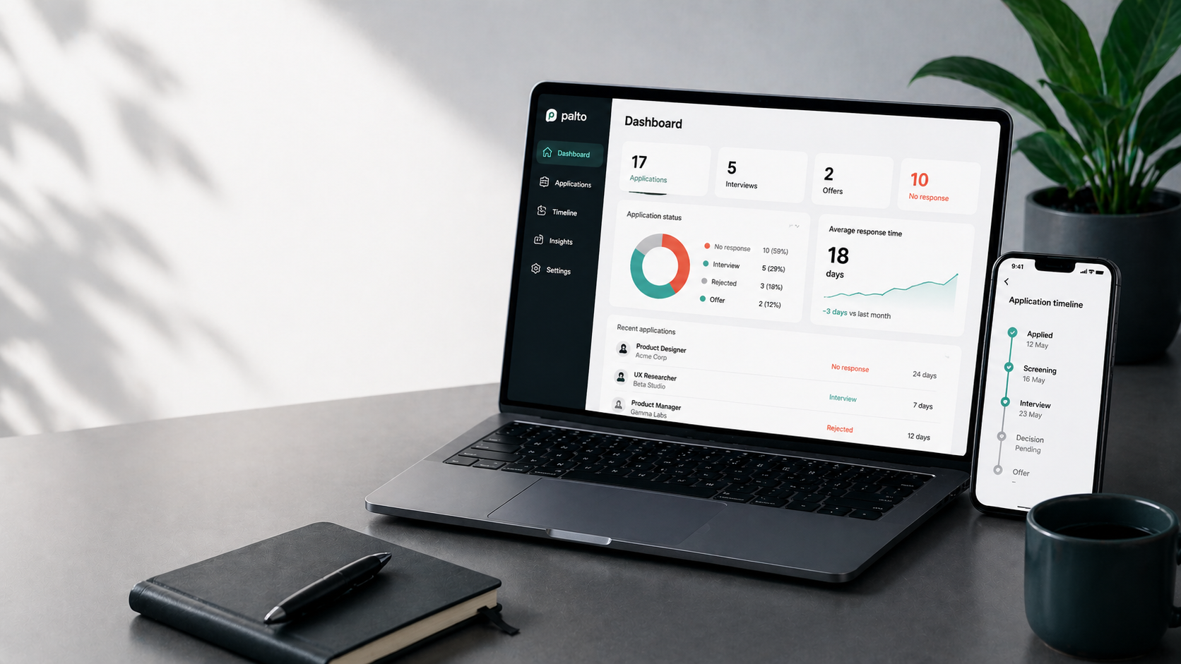 Palto exists because the recruitment process has become unpalatable — silent, opaque and demoralising. We're building a calm, honest place to record what's happening, spot the patterns, and make better decisions about where to spend your energy.